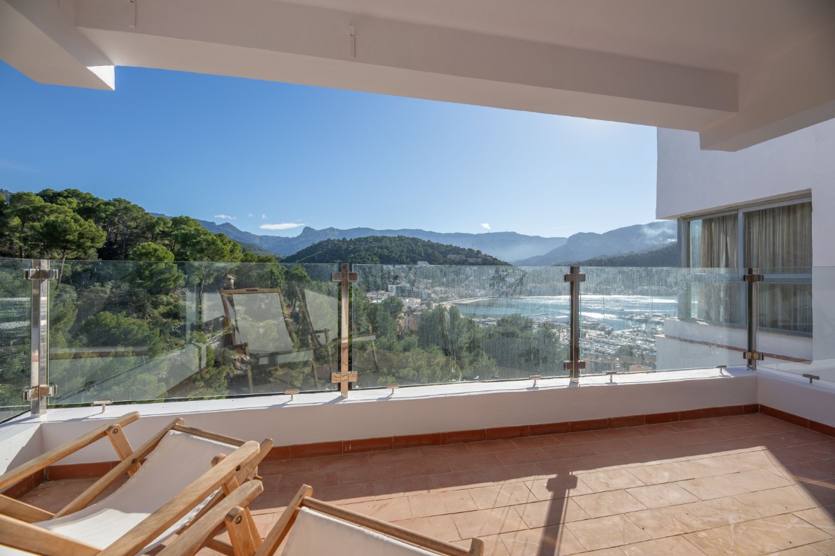 Perfekte Lage mit Blick auf den Hafen von Port de Sóller. Nur wenige Schritte entfernt lädt der Yachthafen mit seinen Restaurants, Strand und Einkaufsmöglichkeiten ein. Diese in 2024 renovierte Wohnung befindet sich im 4. Stock (ohne Aufzug) der Wohnanlage Flamenco in Port de Sóller. Nachdem man die Treppe zur Wohnanlage und dann die vier Etagen hinaufgestiegen ist, bietet sich ein wunderschönes Domilzil mit einer großzügigen Terrasse mit Blick auf die Umgebung. Das Wohnzimmer hat eine offene Küche mit Backofen, Kühlschrank mit Gefrierfach, Induktionsherd (kein Geschirrspüler) und viel Stauraum. Das Schlafzimmer mit Einbauschränken und Klimaanlage warm/kalt hat Zugang zum neuen Badezimmer mit Dusche. Hier gibt es auch ein Verstauschrank mit einer Waschmaschine. Alles in allem eine sehr nette helle und freundliche Wohnung.