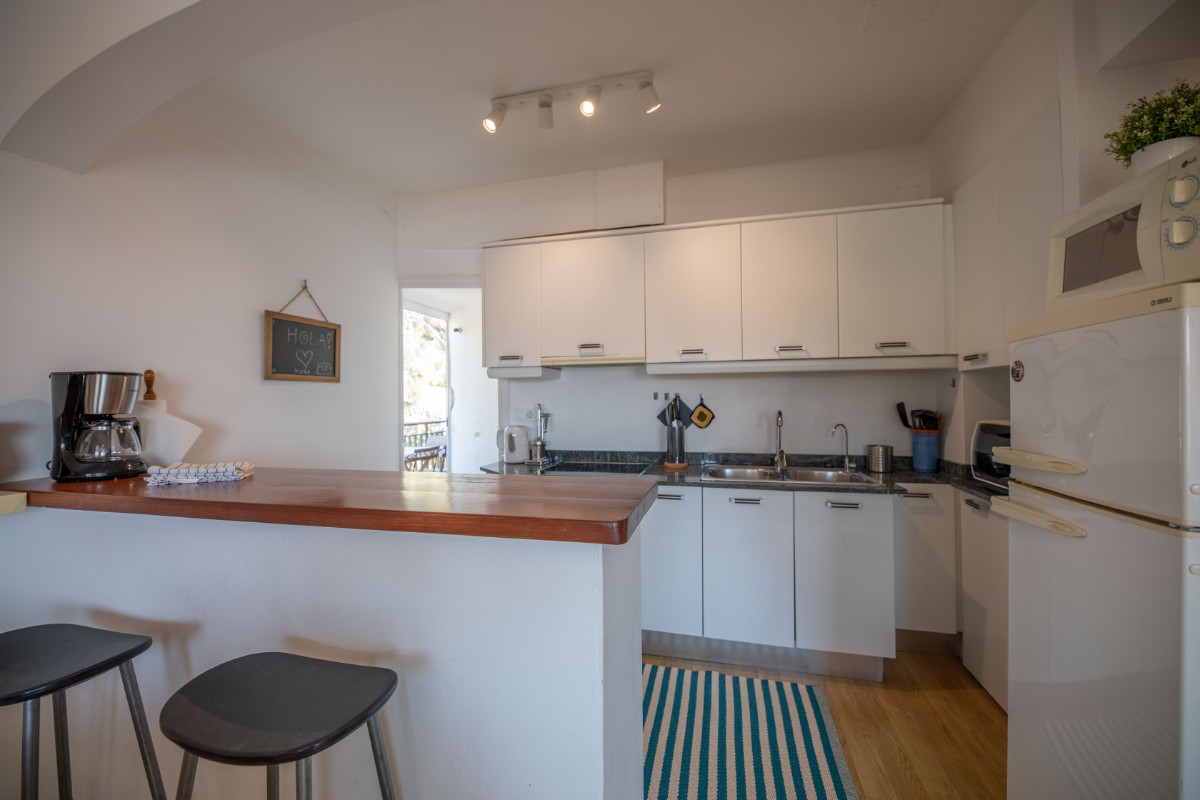 Diese Wohnung befindet sich in einem 5. Stock mit Aufzug, nur wenige Schritte vom Repic Strand in Port de Sóller. Von dem grosszügigen Wohn-Esszimmerbereich mit Sofa, TV/Video,WIFI, CD-stereo, und offener Wohnküche geniesst man einen schönen seitlichen Ausblick zum Hafen und dem Leuchtturm. Die Wohnung bietet den Gästen zwei Schlafzimmer mit Doppelbett und zwei Einzelbetten, ein Badezimmer mit Duschbad, WC und Waschbecken. Die Küche ist sehr gut ausgestattet mit Microwelle, Toaster, Kaffeemaschine, Wasserkocher, Kühlschrank mit Gefrierfach, Herd und Waschmaschine. Vom Wohnzimmer und eines der Schlafzimmer gelangt man auf die möblierte Terrasse mit Blick auf die Berge, welche sogar im Winter Sonne bietet!Es gibt eine Vielzahl an Wanderwegen in der Umgebung, inklusive dem beliebten Spaziergang vom Strand vor dem Haus bis zum Leuchtturm des Hafens. Es ist nicht notwendig einen PKW zu mieten. Die kleine Tramvia ist nur wenige Meter ebtfernt und es gibt im Hafen alle nötigen Restaurants, Shops etc welche man benötigt. Der bekannte Repic Strand mit seinen Cafes und Strandrestaurants und Bars ist nur wenige Meter vom Haus entfernt.
