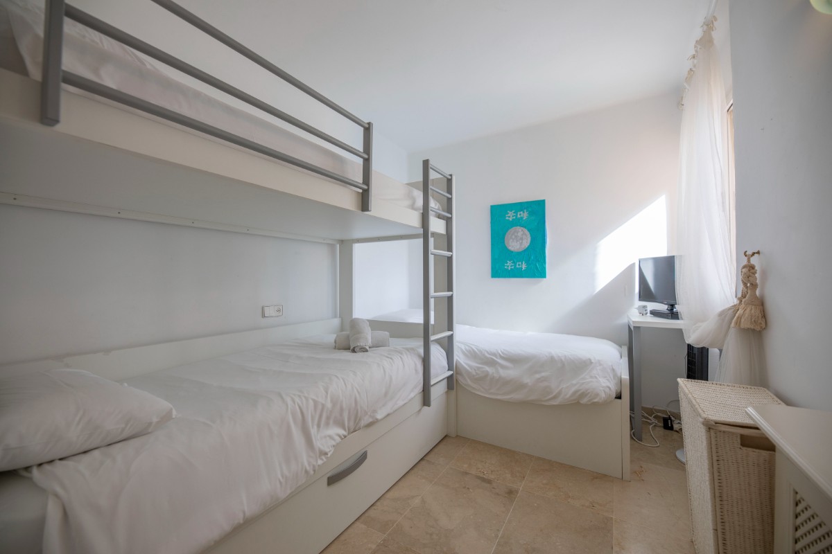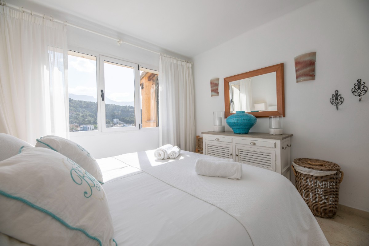 Wunderhübsche Wohnung mit zwei Schlafzimmern und zwei Bädern. Das zweite Schlafzimmer ist mit Etagenbetten ausgestattet , so dass bis zu 5 Personen in dieser Wohnung Platz finden. Es verfügt über Klimaanlage (warm/kalt) und Sat-TV. Die Wohnung besticht durch ihr helles freundliches Ambiente. Der offene Wohnbereich mit offener Wohnküche führt direkt auf die überdachte Terrasse mit fantastischem Panoramablick auf die Bucht, die umliegenden Berge und sogar bis zur historischen Kirche von Sóller. Für Sonnenhungrige führt eine Treppe hinauf zur privaten Dachterrasse und Chill Out Bereich. Ebenfalls ist hier ein Gas BBQ vorhanden. Zur Hausgemeinschaft gehört ein Pool - ideal für Kinder. Der Strand ist allerdings nur die Treppen hinab und über die Strasse. Bitte beachten Sie es führen mehrere Treppen zur Wohnung so dass diese nicht für gehbehinderte geeignet ist.
