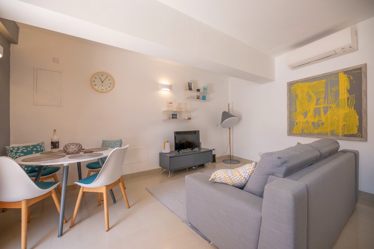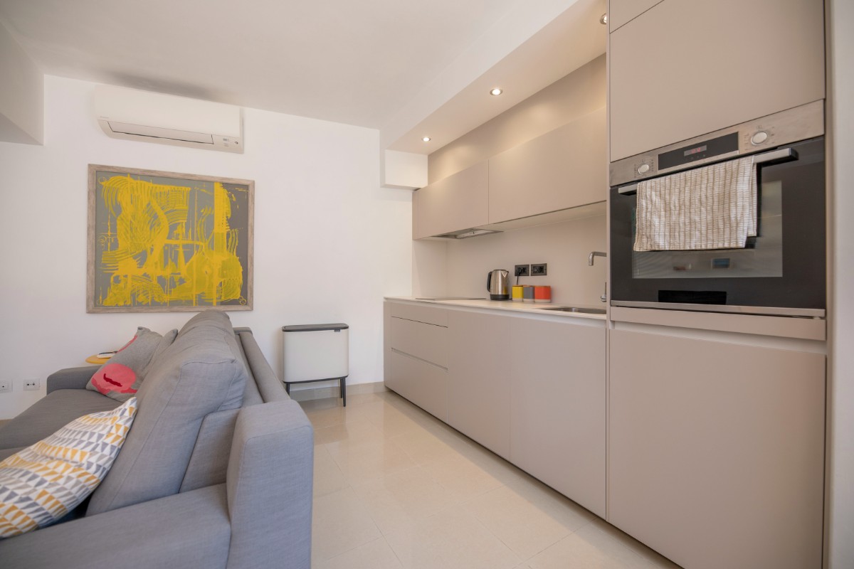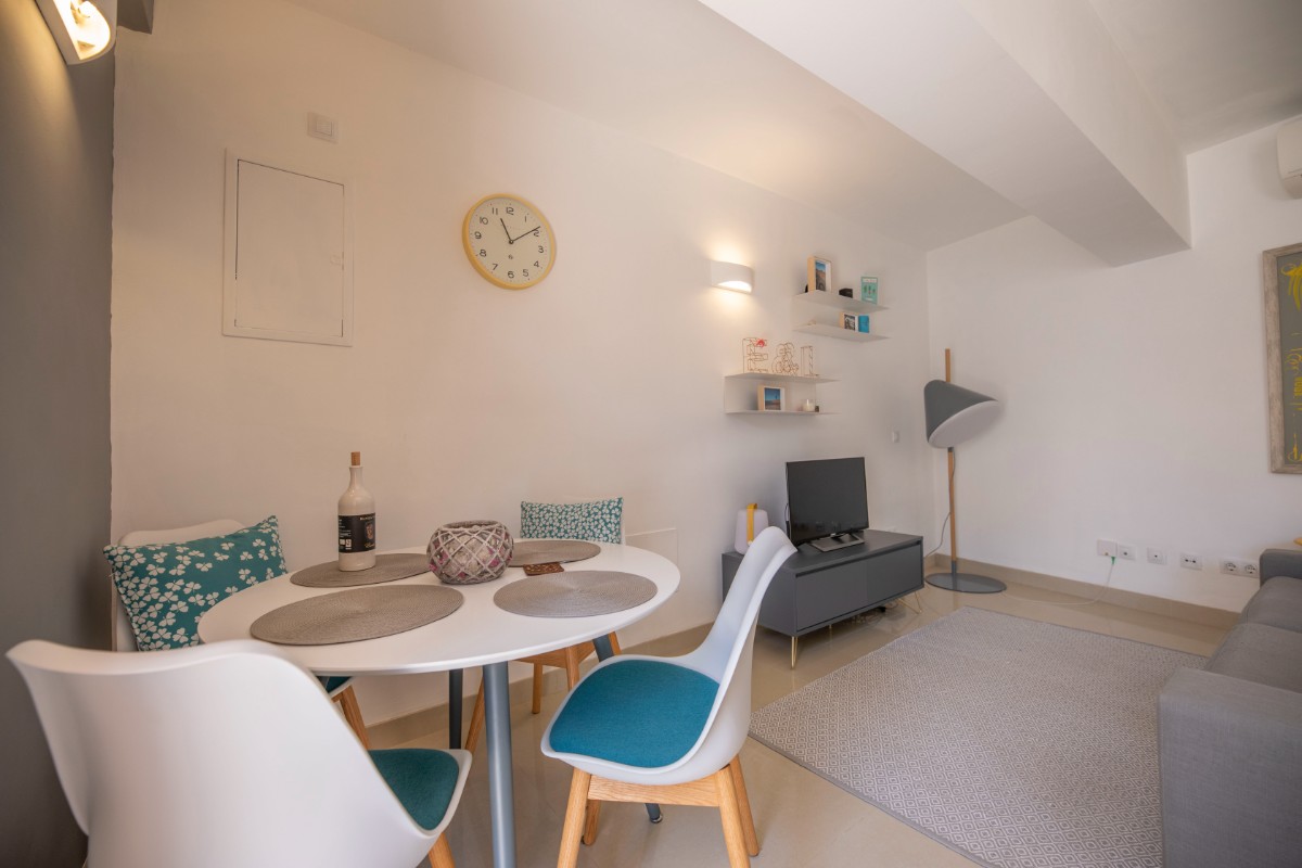 Diese Wohnung befindet sich im Erdgeschoss eines kleinen Gebäudes mit weiteren 4 Wohneinheiten. Die Wohnung ist in perfektem Zustand und verfügt über einen Wohnbereich mit offener Küche, ein komplettes Badezimmer und ein Doppel-Schlafzimmer. Es ist in beiden Zimmern mit einer Klimaanlage ausgestattet. Jede der 4 Wohnungen nutzt den Terrassenbereich direkt vor der eigenen Wohnung, da es sich um Gemeinschaftseigentum handelt. Der Bereich vor der zur verkaufenden Wohnung liegt am Ende des Ganges und ist daher sehr ungestört. Die Terrasse ist sehr sonnig und ideal zum Sonnenbaden und Entspannen, nur wenige Meter vom belebtesten Teil des Hafens entfernt.